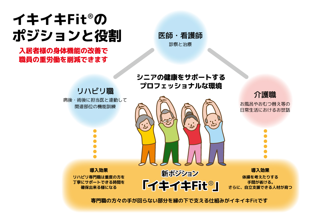 職員不足を根本解決するためには、高齢者の日常生活動作の改善することに特化した=健康長寿を叶える運動イキイキFit®️で自立できる生活を促進。「自分でできる事が増える」ことで介護負担が削減します。