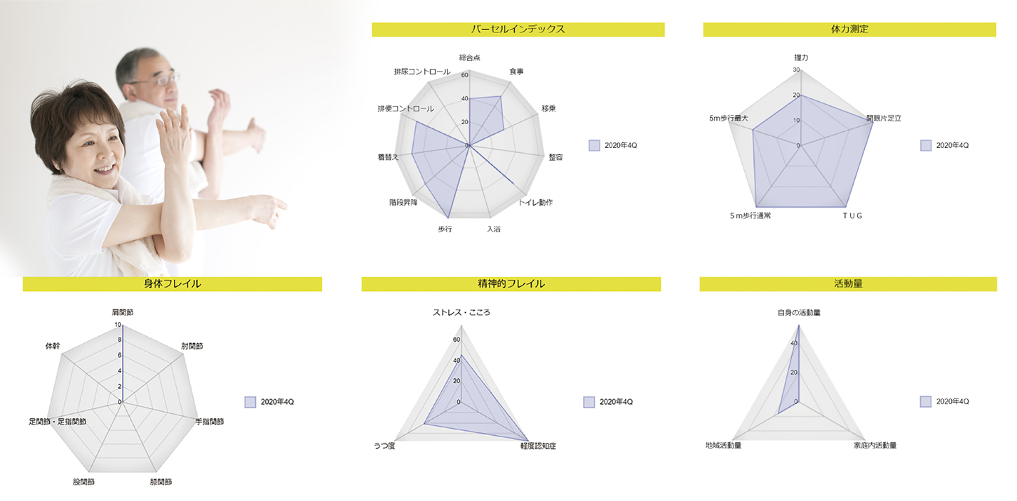 元気な時は立位での運動·体力低下の時は座位での運動·寝たきり時はベット上でできる運動を行えるようになっています。