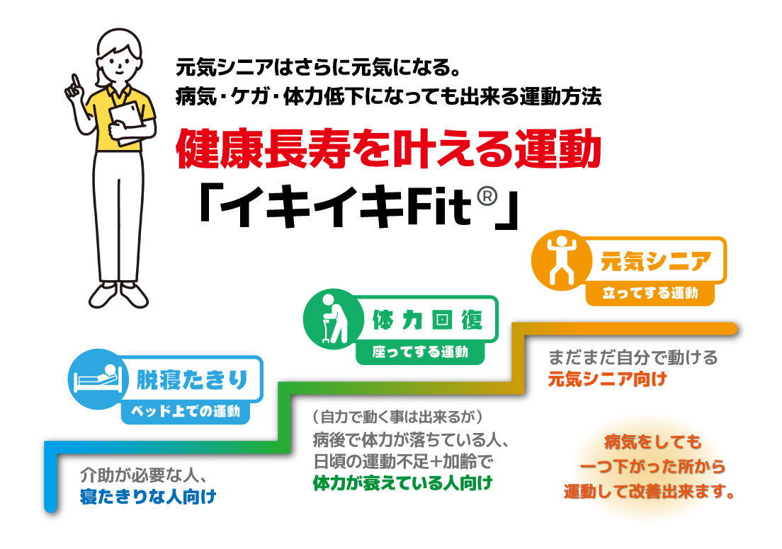 高齢者には重い負荷を与える事ができませんので、毎日適切な運動=イキイキFit®️を実践することで、年齢に関係なく身体が改善できるように考案された運動プログラムです。自分でやるから「今日も自分で頑張れた!」と自信が持てるようになります。